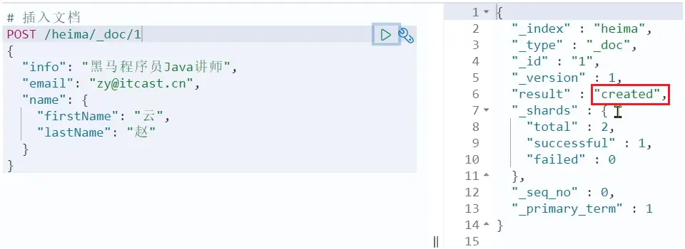 - 創建文檔:POST /{索引庫名}/_doc/文檔id { json文檔 }