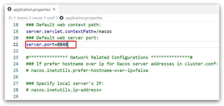 如果無法關閉佔用8848端口的進程,也可以進入nacos的conf目錄,修改配置文件中的端口: