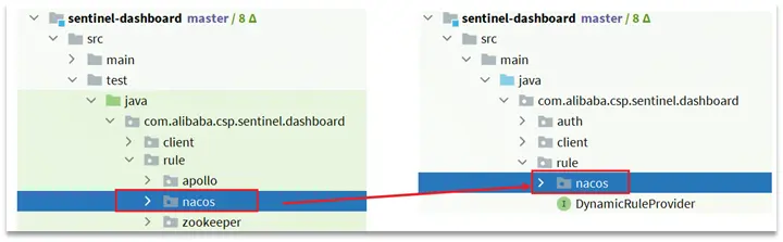 在sentinel-dashboard的test包下,已經編寫了對nacos的支持,我們需要將其拷貝到main下。