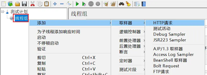 給線程組點鼠標右鍵,添加http取樣器: