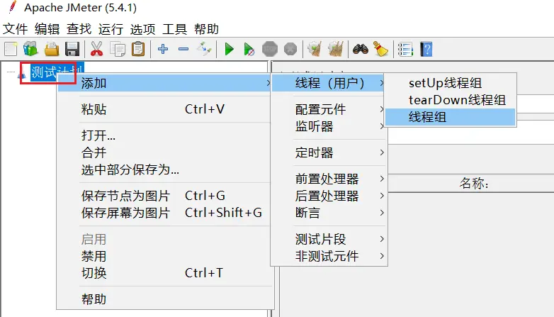 在測試計劃上點鼠標右鍵,選擇添加 > 線程(用户) > 線程組: