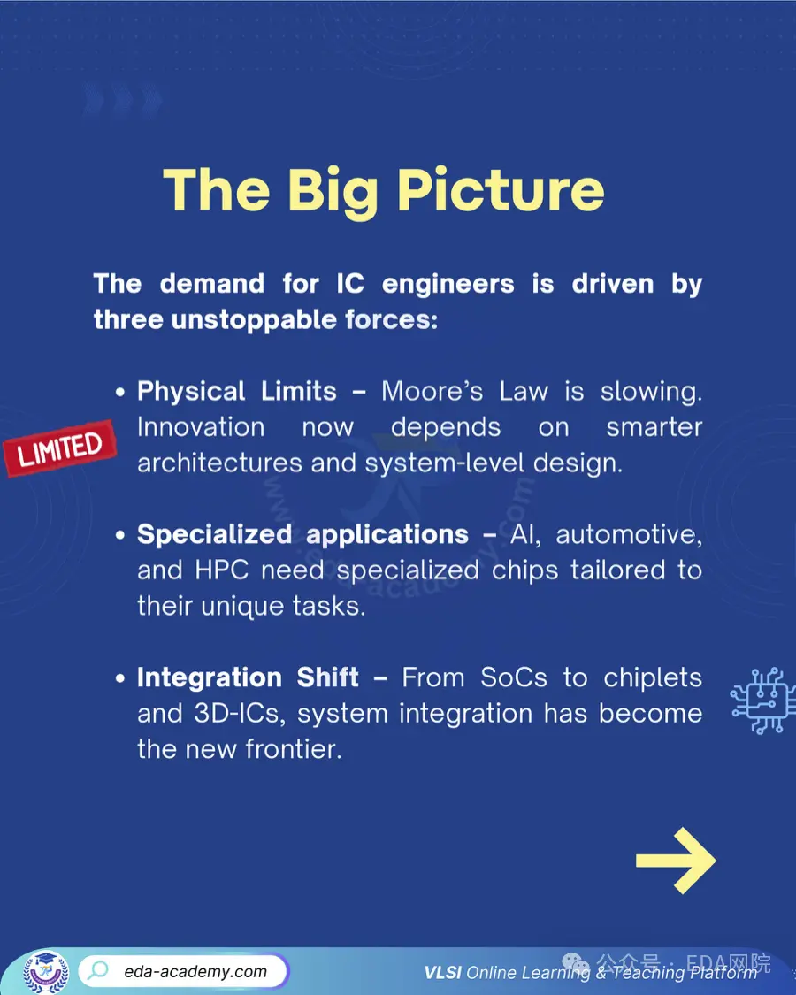 面對摩爾定律放緩、AI 和汽車電子爆發、Chiplet 與 3D-IC 持續改寫系統架構,半導體行業正在進入一個全新的競爭週期。技術路徑的變化,也正在深刻影響人才需求結構:行業不再只需要“通才”,而是更稀缺、也更關鍵的專業型工程師。