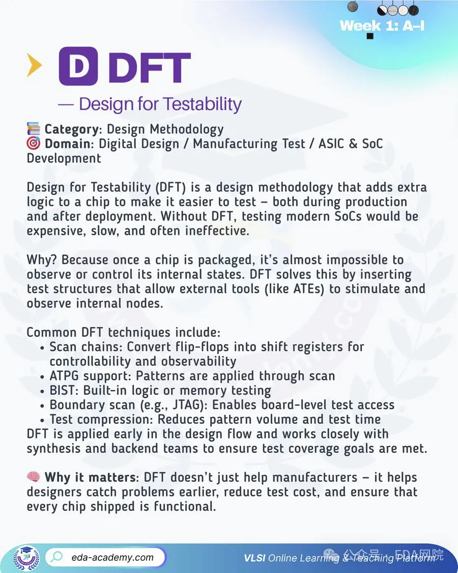 • DFT:為了讓芯片可測而在設計階段鋪好的“伏筆”。