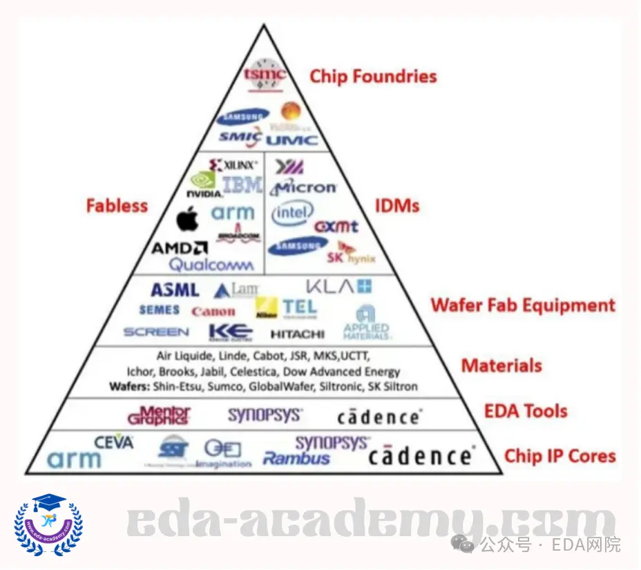 這一級指的是用於芯片設計的軟件工具廠商,比如 Synopsys、Cadence、Mentor Graphics(現為西門子一部分)、TestFlow。這些工具負責從 RTL (寄存器轉移級)設計、版圖佈局、後仿驗證、到硅後驗證。沒有這些工具,設計團隊無法將想法變為可製造的晶圓藍圖。軟件層面雖然是“隱形”但卻是芯片成功的前提。
