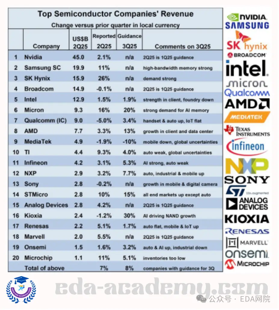 以下是 Q2 2025 數據下的前 10 大半導體廠商(按營收):