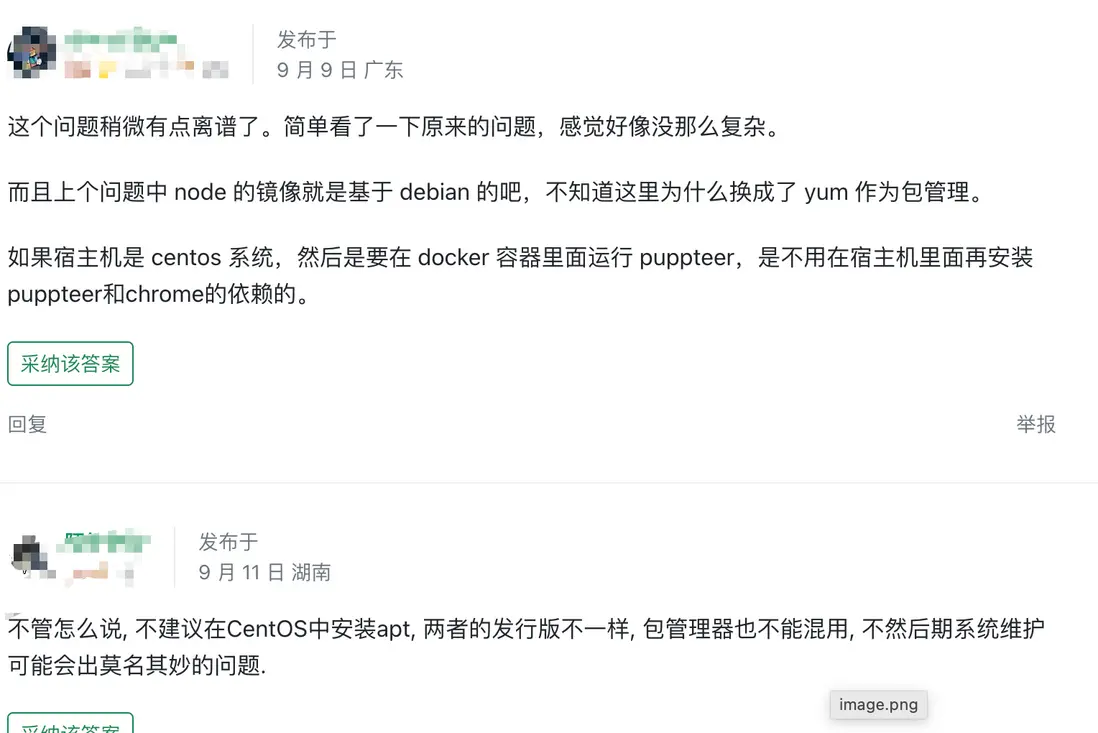 為了驗證其他回答,這裏我也走了一些彎路,比如在宿主機為CentOS系統,依賴管理工具為yum情況下去安裝apt工具,還提交了相關問題,此處省略一千字。