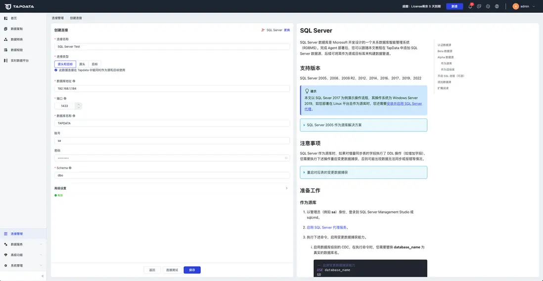• 連接類型:支持將 SQL Server 作為源或目標庫。