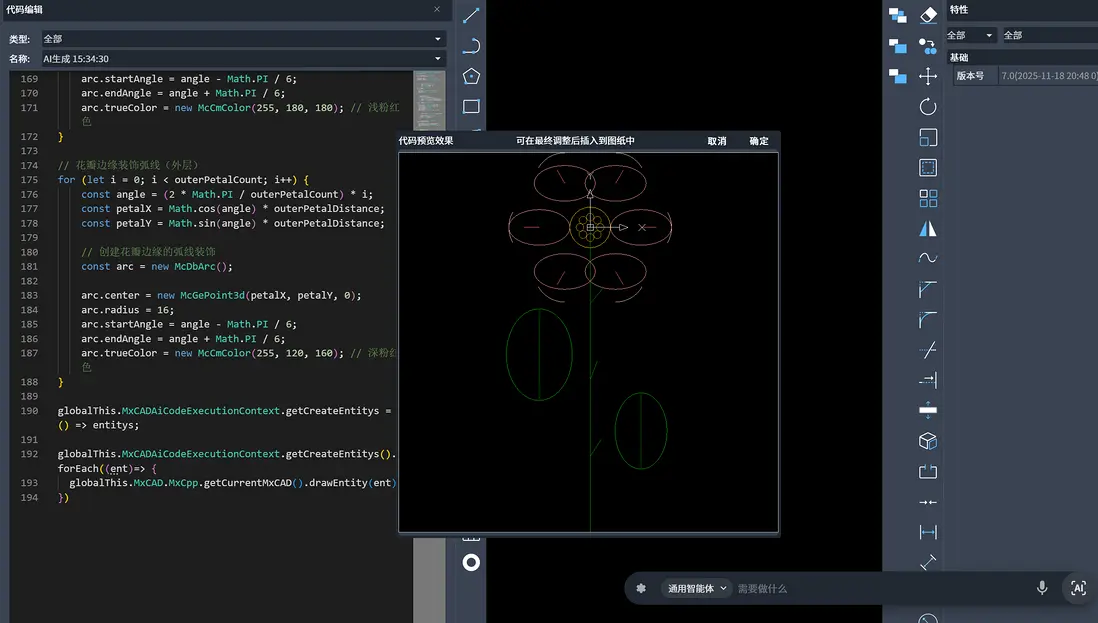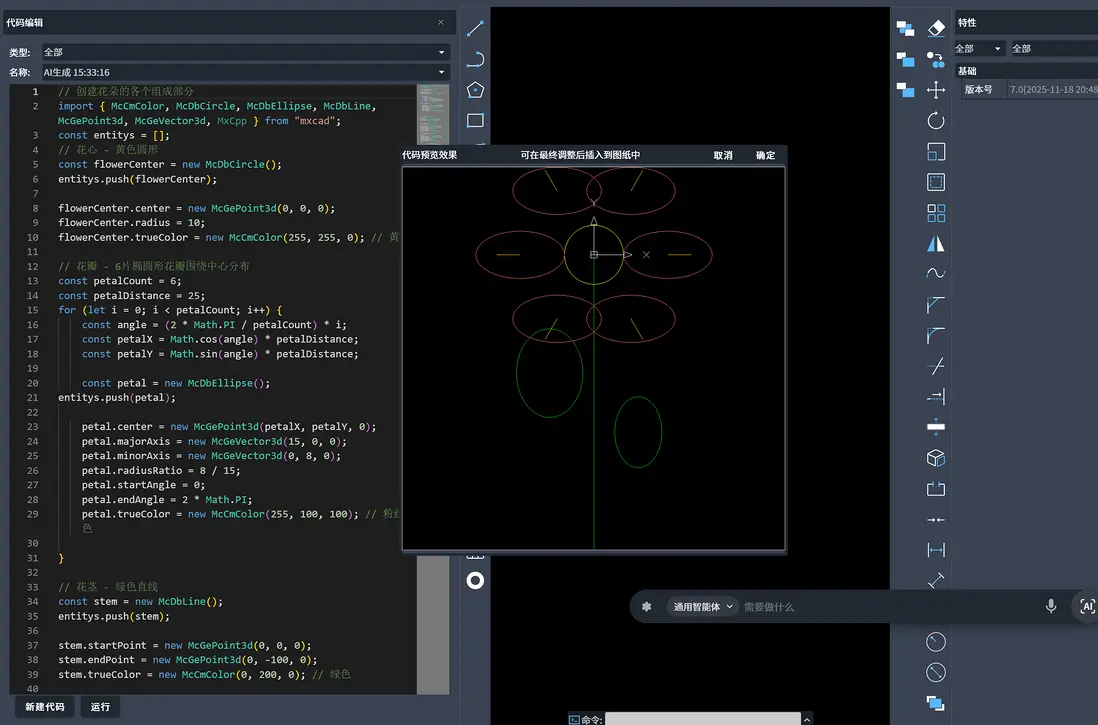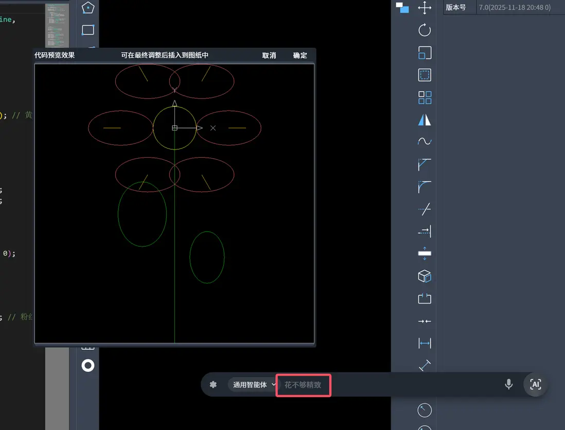 等待一會兒, 就把代碼生成出來給你看,並且還有預覽效果,如果滿意的話點擊確認就可以把這朵花插入到圖元中了。如果不滿意,我們可以繼續與AI對話進行修改,如下圖: