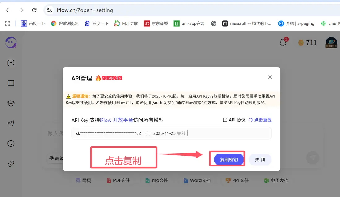 我們需要線配置AI的api接口。這裏我們選擇iflow AI服務,這是目前國內免費的最佳供應商,如下圖:
