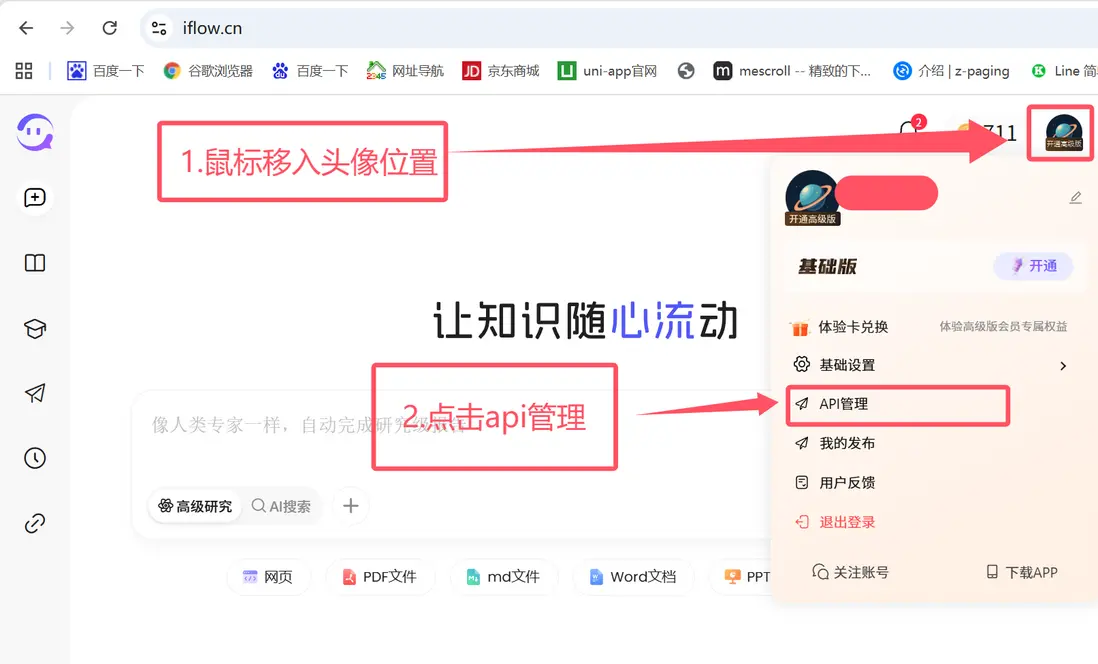 首先我們打開https://iflow.cn 登錄賬號,然後我們鼠標移入頭像,找到api管理,如下圖:
