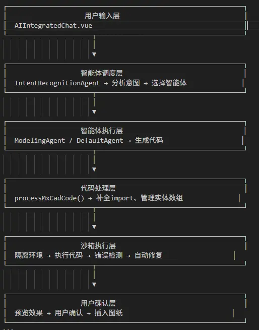 用户輸入 → AI生成代碼 → 沙箱預覽 → 錯誤檢測 → 自動修復 → 用户確認 → 插入圖紙