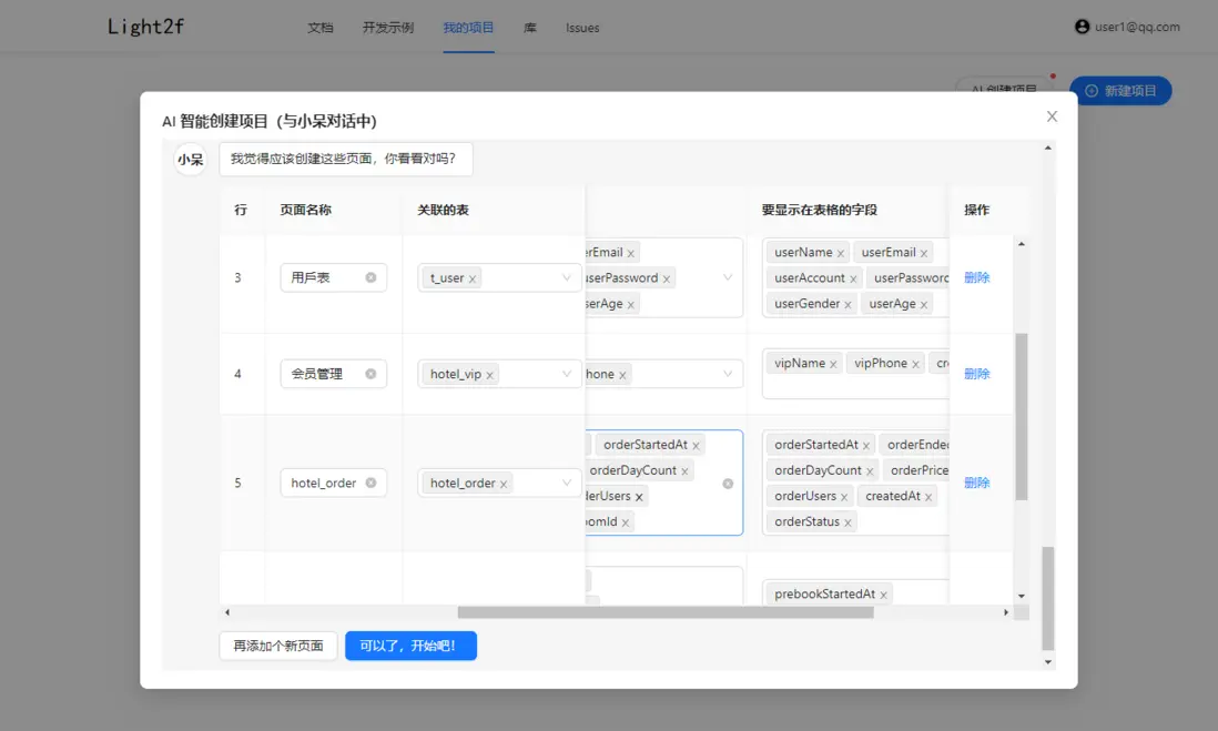 點擊 我的項目-AI智能創建項目 選擇 數據庫結構導入 上傳我們導出的庫結構(即創建表的sql,一個文件,支持多個創建語句)