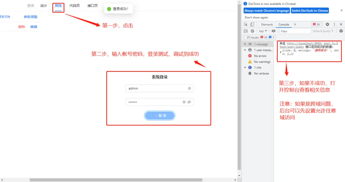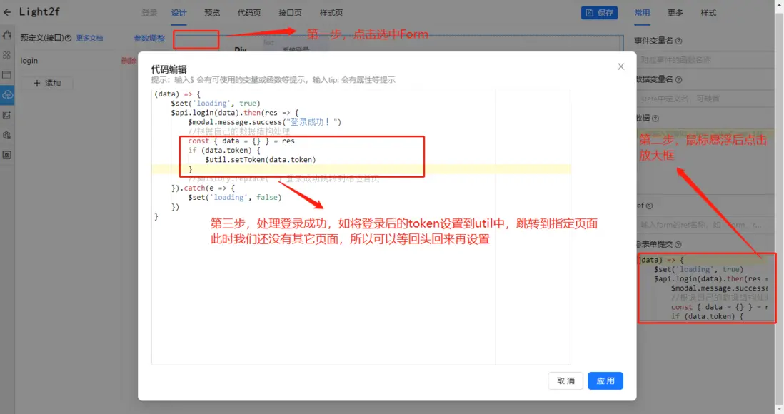 當然,有可能你還需要個登錄進行驗權。我們進入設計頁面,配置一下登錄信息,以及登錄成功跳轉到哪過頁面即完成系統,我們就可以在預覽中直接使用,也可以下載到本地部署啦,一個系統就完成了。