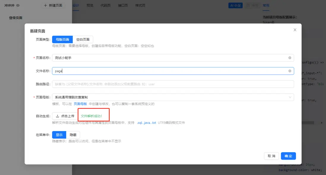 新建頁面,輸入頁面名稱,與文件名稱(同理對應上面的:{fileName}),然後選擇你的 java 對應的表實體,或者單表創建語句,或者文本描述文件。