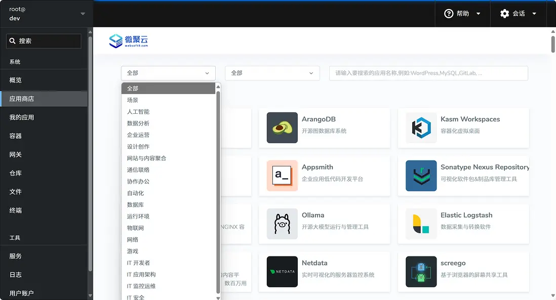 W9通過預置Docker鏡像(如Nginx+PHP-FPM+MariaDB+Redis)實現全自動化部署,支持多應用組合(如WordPress+Nextcloud)。