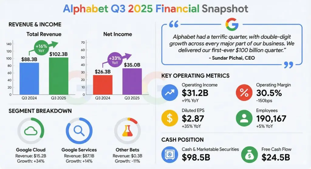 財報信息圖(數據導入):[輸入谷歌最新財報的 PDF 文件] “生成一個簡潔現代的信息圖,概括這份財報的關鍵財務亮點。包含‘營收增長’和‘淨利潤’圖表,並在風格化的引言框中突出顯示 CEO 的關鍵語錄。”