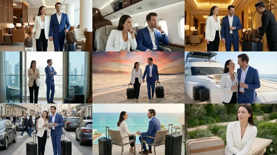 請創作一個引人入勝的九部分故事,包含九張圖片,故事中需出現一位女性和一位男性,他們正在拍攝一部屢獲殊榮的豪華行李箱廣告。故事應有跌宕起伏的情感,最後以一位女性手持品牌標識的優雅照片結尾。男女主角的身份和着裝必須保持一致,但可以從不同的角度和距離拍攝。請逐一生成圖片。請確保每張圖片均為 16:9 橫向格式。