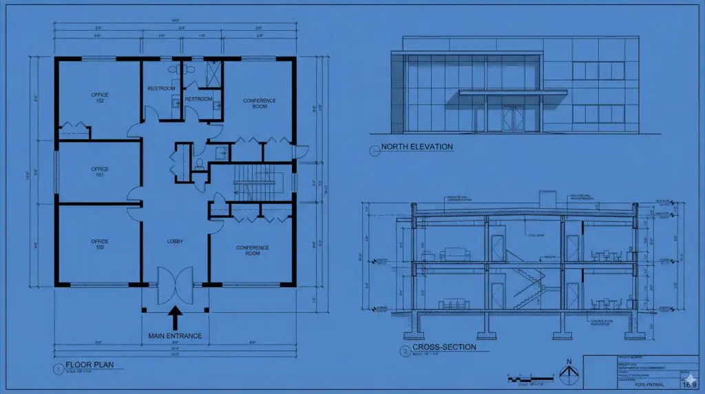 技術圖紙:繪製一份正投影藍圖,以平面圖、立面圖和剖面圖的形式描述該建築物。使用專業建築字體清晰標註“北立面”和“正門”。格式為 16:9。