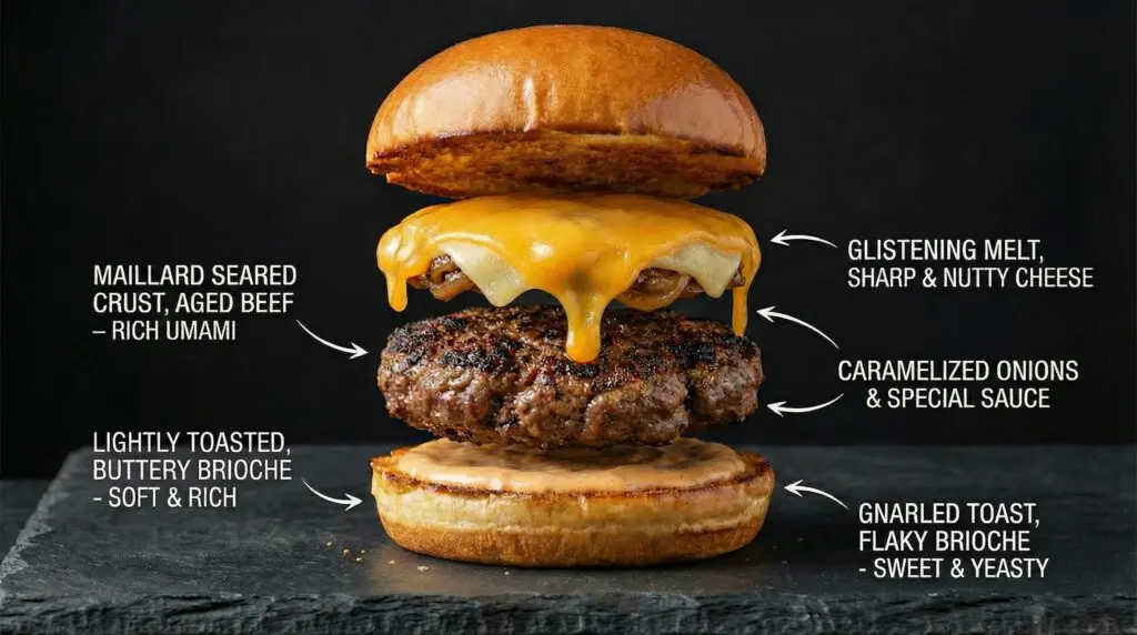 “創作一幅超逼真的美食芝士漢堡信息圖,將其拆解,展現烤過的奶油蛋卷麪包的質地、肉餅煎至焦香的外皮以及閃閃發光的融化芝士。為每一層標註其風味特徵。”