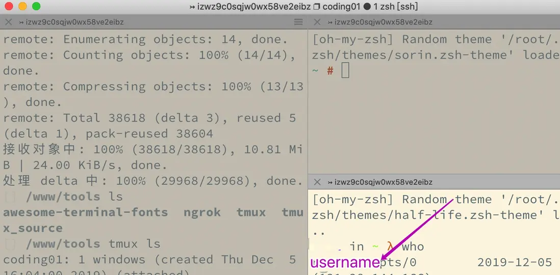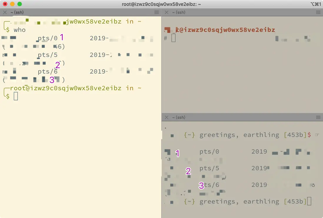 在 Mac 上,iterm2 也是可以做到分屏,但如果結合 iterm2 與 ssh 的話,iterm2 分屏需要不斷地 ssh <server>,導致的後果就是有多個用户連接,使用 who 命令查看登錄用户數。