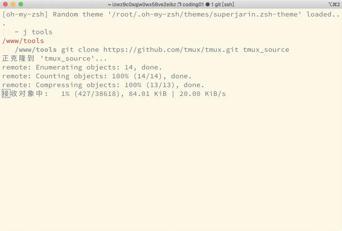 我做了一個測試,先在 tmux 環境下 git clone 代碼。