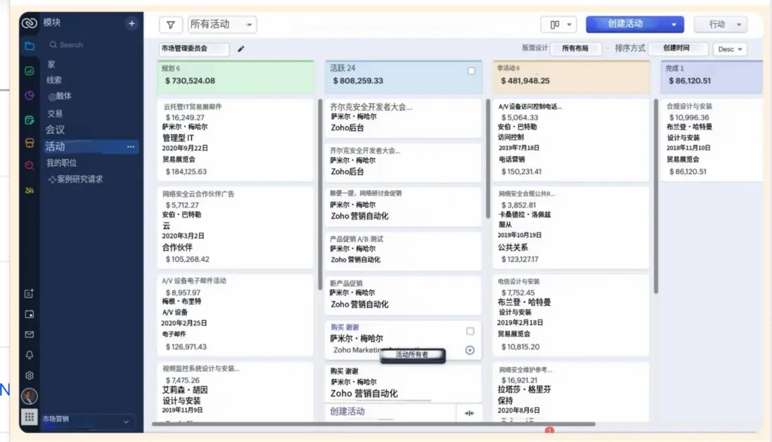 Zoho CRM是市場上最全面和靈活的客户管理系統之一,功能涵蓋銷售自動化、營銷自動化、客户支持、購買預測分析、工作流管理、團隊協作等多個方面,核心功能包括: