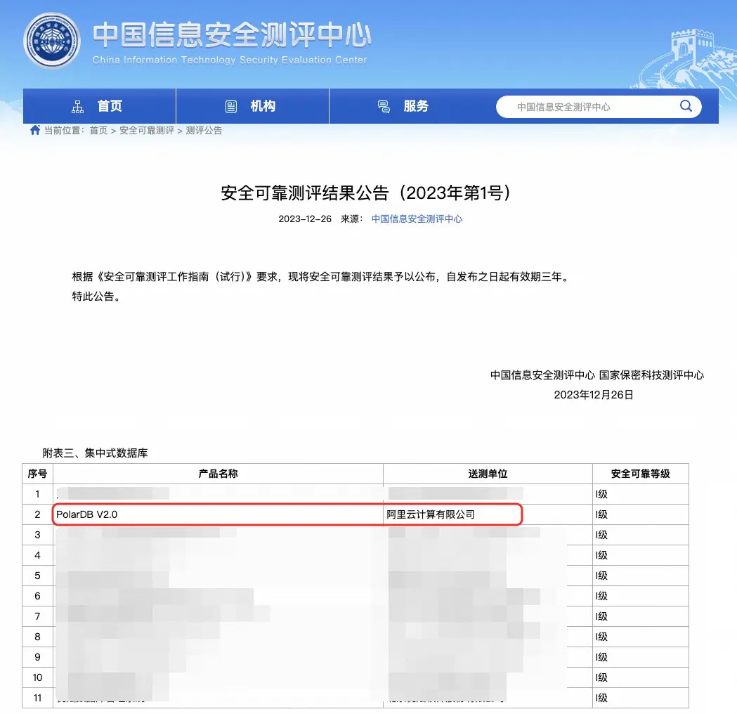 中國信息安全測評中心於2023年12月26日公佈了安全可靠測評結果,PolarDB V2.0為首批通過中國信息安全測評中心國家安全可靠等級“I級"認證的數據庫產品。