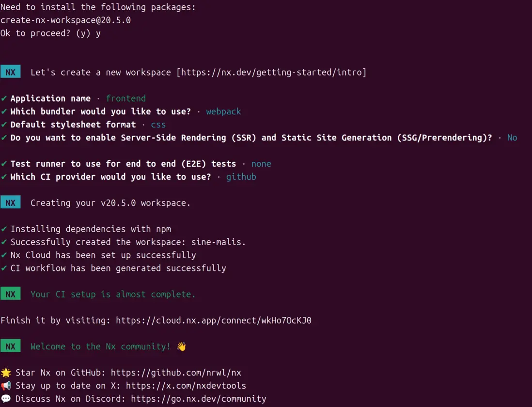npx create-nx-workspace@latest yourProjectName --preset=angular-monorepo