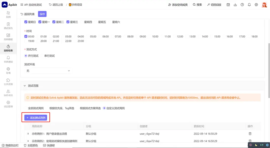 在編輯頁中設置定時任務的名稱、循環次數、週期等信息,然後設置需要定時測試的測試用例、測試的環境、測試完成後的通知方式等信息,點擊保存即可。
