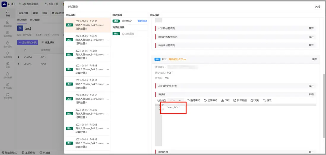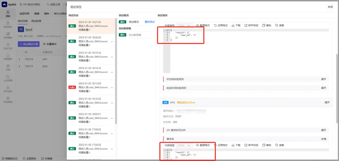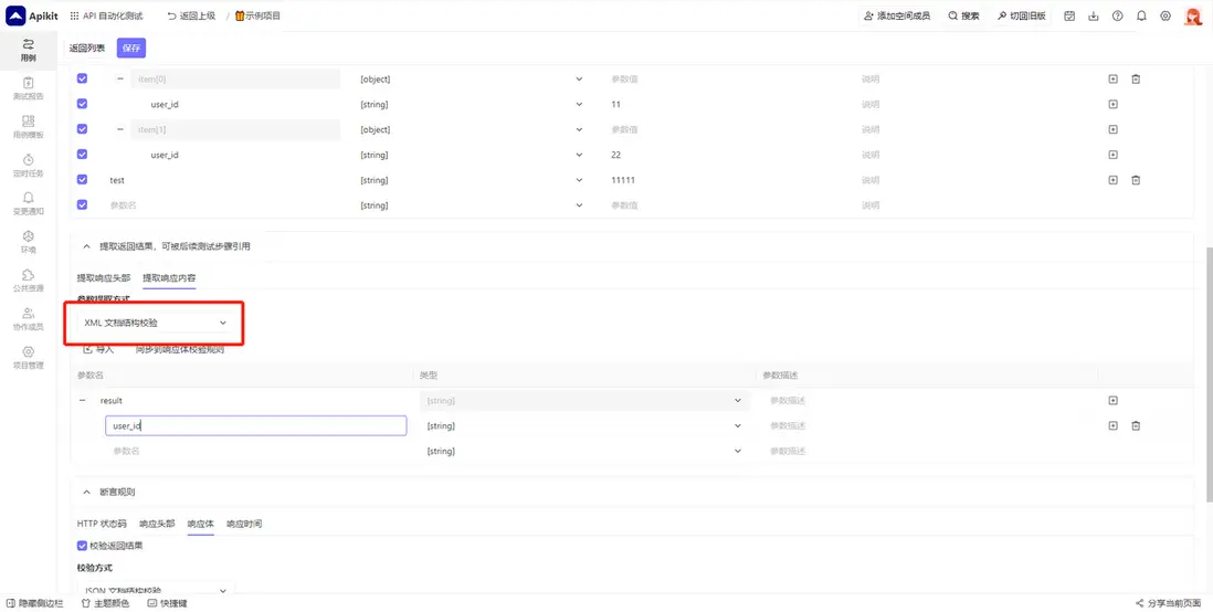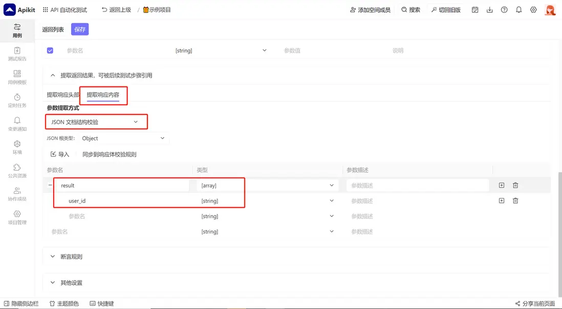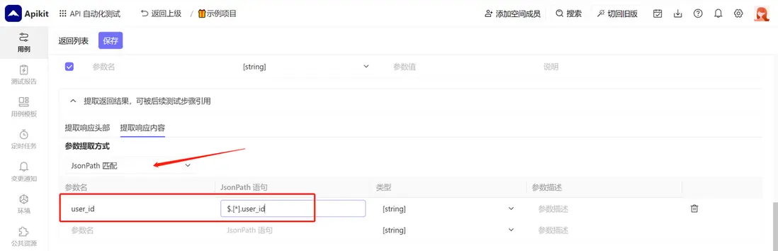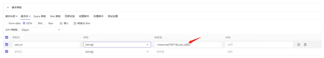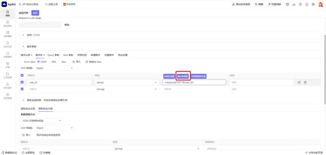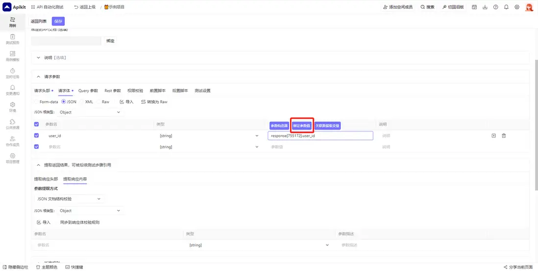需要還原所提取參數的完整層級、結構。如上圖API1的返回結果,result為一個數組,數組內有對象元素user_id,那麼在提取的格式中,應該還原他的層級結構,如下圖: