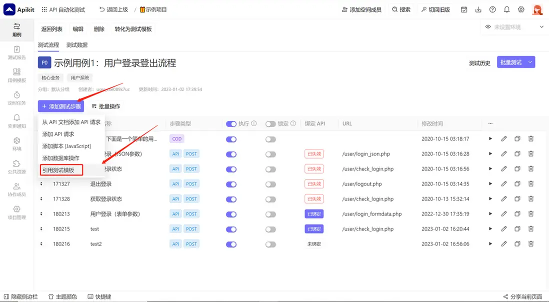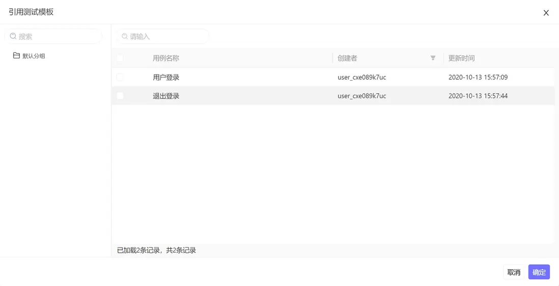測試模板的創建和測試方式與普通的測試用例一致,當您創建好測試模板之後,可以在流程測試用例頁面,點擊引用用例按鈕,在彈窗中選擇需要引入的測試模板即可: