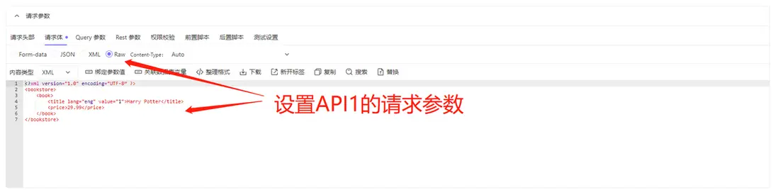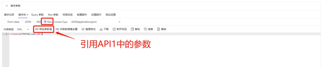 在API2中請求格式選擇Raw,並點擊關聯其他步驟參數值,引用API1中的參數