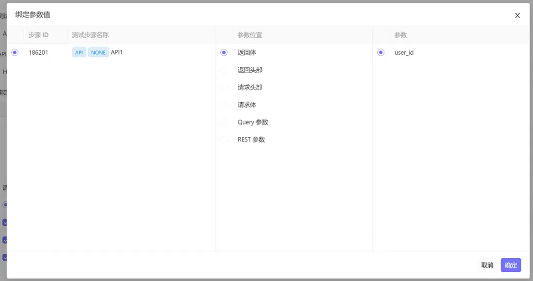 在API2中可以引用API1中設置的返回參數,點擊綁定參數值在API2中可以引用API1中設置的返回參數,點擊綁定參數值