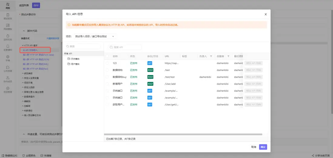 進入編輯用例頁面,點擊 從API文檔導入 ,在新的頁面中,選擇項目、分組以及需要導入的API文檔,然後點擊保存即可。API 自動化測試平台 通過這種方式將API文檔管理與自動化測試關聯起來,能夠幫助測試人員節省大量的測試時間: