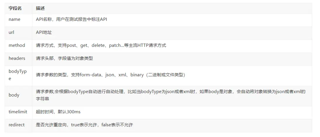 API 自動化測試平台為代碼模式的測試用例設計了一套簡單的API信息模板,因此只需要極少的代碼即可完整地描述API信息,模板中各個字段含義如下: