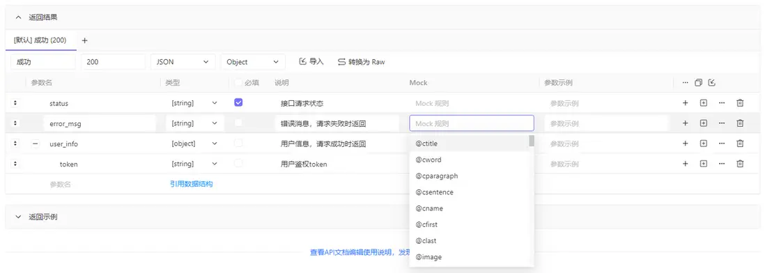 簡易Mock功能可在編寫API文檔的時候,同時對不同的返回結果進行Mock配置。並且可預置智能Mock規則,在編寫返回參數時,若參數名和字段類型匹配智能Mock規則時,系統自動填入該參數的Mock規則。