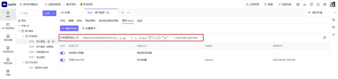 配置簡易Mock後,API文檔會自動生成Mock URL,用户可複製該URL直接調用得出想要的數據結果。