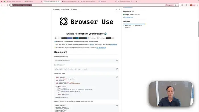 解決方案的核心是 browser-use,這是一個 Python 庫,使 AI 代理能控制網頁瀏覽器,是將人類語言轉化為機器動作的引擎。