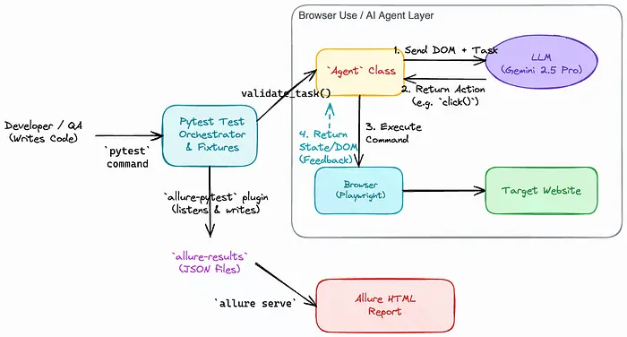 整個流程從開發者開始,他用自然語言編寫測試並執行 pytest 命令。該命令激活 pytest 框架,作為中央編排器,其首要任務是查閲 conftest.py 文件,為諸如 Gemini LLM 實例和瀏覽器會話等工具做好準備,這些固定功能隨後將對所有測試開放。每個測試都提供自然語言任務和預期輸出。