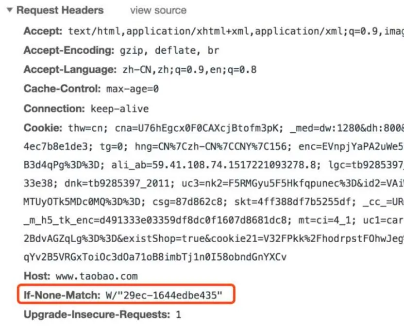 當瀏覽器第二次發送請求時,會在請求頭的 If-None-Match 字段加上上次請求返回的 ETag 標識。HTTP 服務器收到該標識後,會對該資源的標識進行對比,如一致,則證明該資源無更新,然後響應 304 告訴客户端可直接使用瀏覽器資源副本。若不一致,服務器則響應 200,並向客户端發送新的資源。