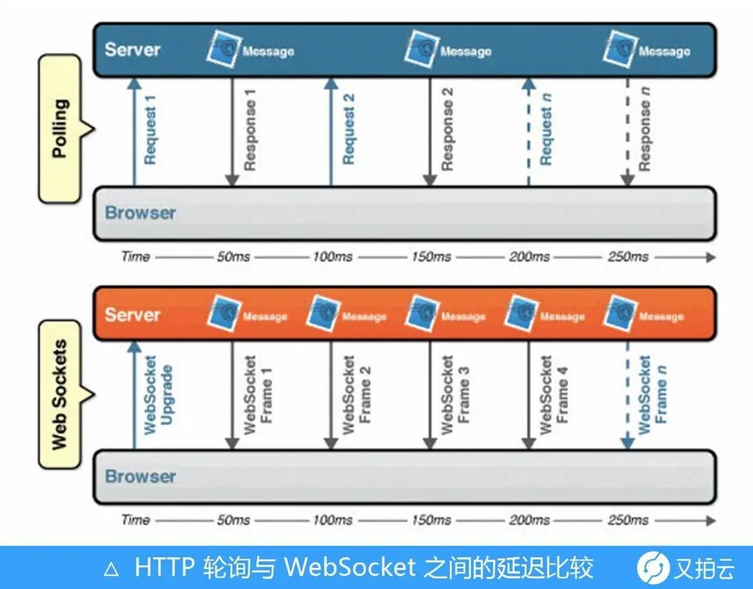 由於 WebSocket 協議是全雙工的,所以服務器可以隨時主動給客户端傳輸數據。相對於 HTTP 請求需要等待客户端發起請求服務端才能響應,延遲明顯更少。