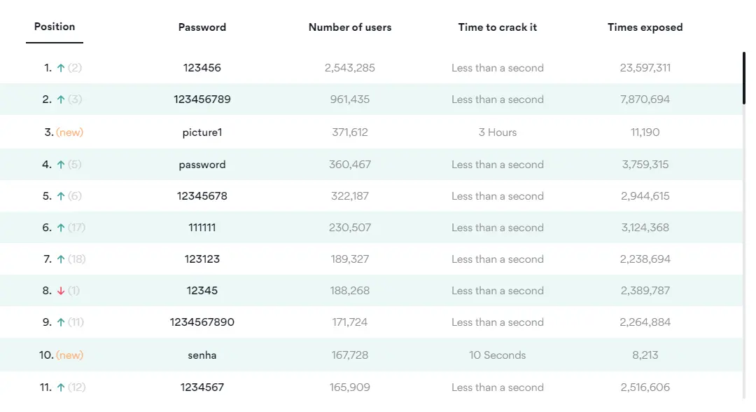 在 2020 年末,NordPass 公佈了 2020 年使用率最高的 200 個密碼,排名靠前的幾個密碼分別為 123456、123456789、password、12345678、111111、123123、12345、1234567890、1234567、000000、1234 …… 除了純數字,還有各種數字和字母組合,例如:qwerty、abc123 和 picture1 等等。