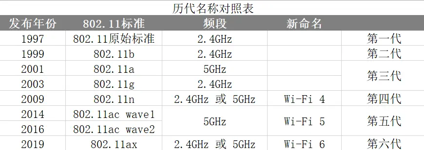 起初無線網絡是按照 IEEE 802.11 標準的 802.11,802.11b,802.11a/g,等這樣來命名,但是這樣的名稱很難被大眾所熟悉和了解,於是在後期便採用了“Wi-Fi+ 數字”來命名,經過不斷地發展和創新,Wi-Fi 到現在已經發展到了第六代,也就是上面説的 Wi-Fi 6。