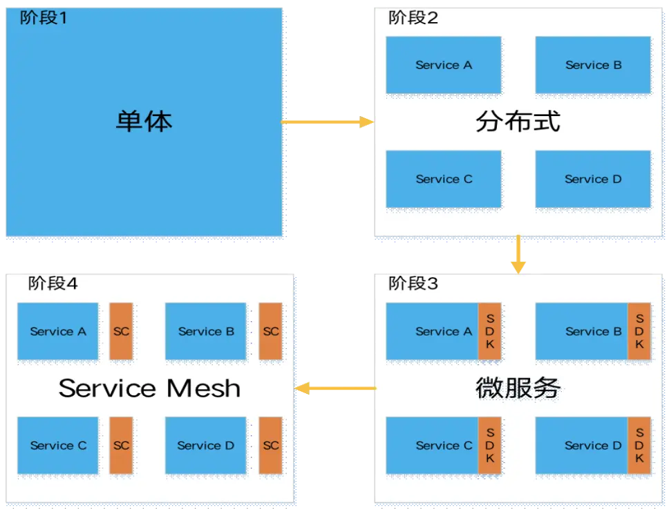 説到 Service Mesh 為什麼會出現,我們需要先回顧服務演進歷程,大體經歷如下階段: