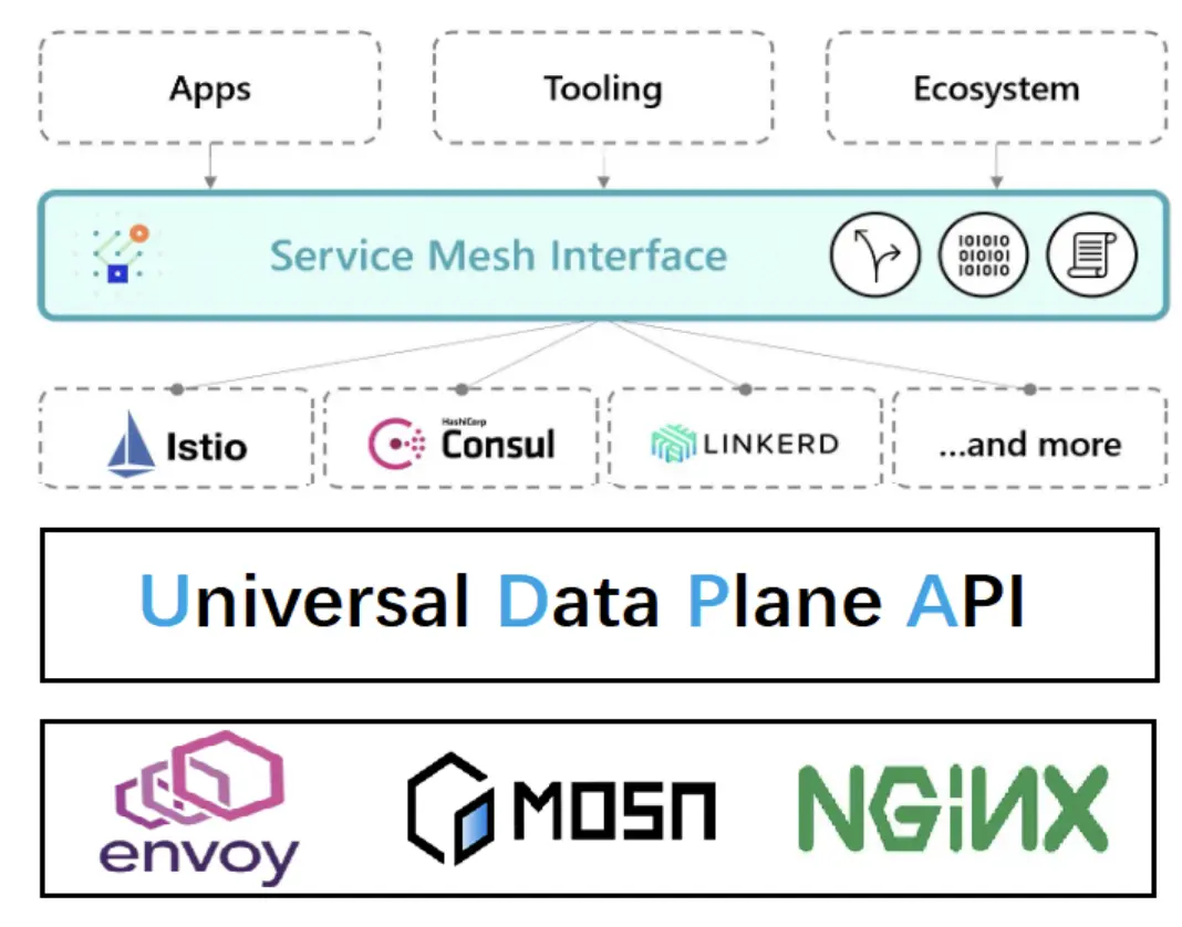 除了開源生態適配外,MOSN 也在嘗試標準化。大家都知道「標準」和「規範」很重要,例如谷歌提議 UDPA 規範,在數據面之上的一層標準 API 解耦控制面和數據面通信;而微軟則提出 ServiceMesh Interface,在控制面之上的一層標準 API 解耦控制面和上層應用/工具,這些規範的背後都是為了遵守“防止鎖定,可方便用户靈活切換”原則。