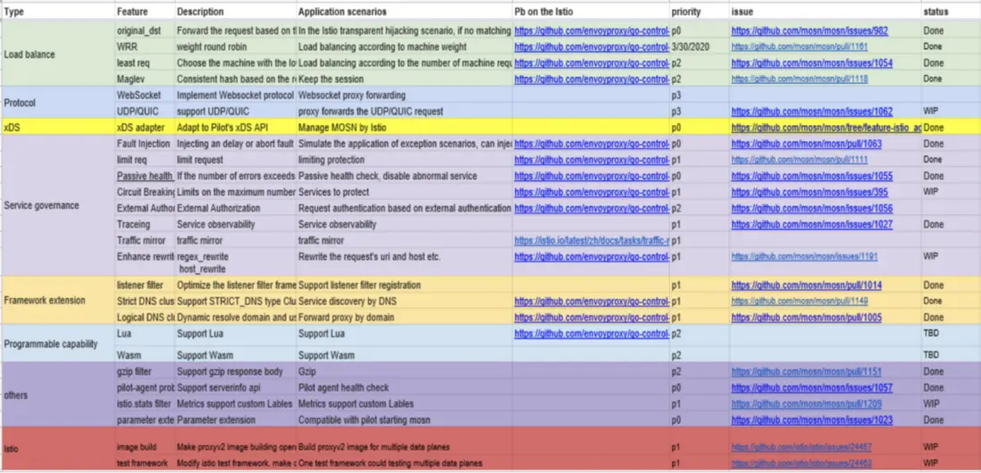 下圖展示了 MOSN 適配 Istio 整個功能列表,值得一提的是相當多的功能都是外部開發者貢獻的。