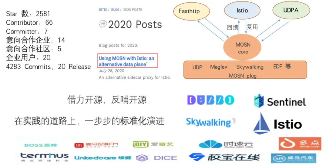因此在 MOSN 在適配 Istio 以及 Dubbo、Skywalking 等組件後,我們認為不僅要適配別人,也要標準,這需要我們關注並積極參與開源社區建設。事實上在適配 Istio 的過程中,我們已經在和 Istio 官方溝通,既參與 Istio 的開發,也參與了 UDPA 討論及標準制定。