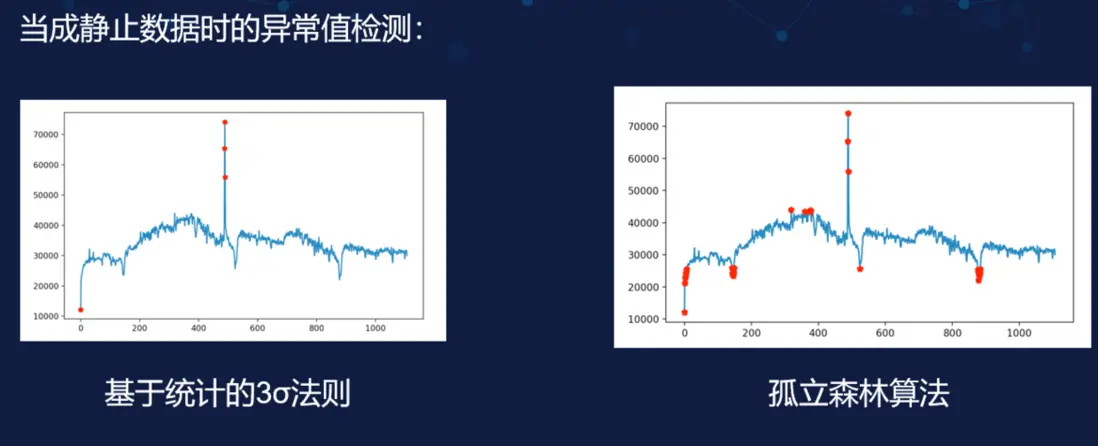 上圖是將之前的日活統計當成整體數據後檢測的結果,這是一個靜止的數據。我們可以看到左圖 3σ 法則的檢測效果並不好,只檢測出了少數的幾個點;而右圖使用孤立森林算法則的優勢則可以很明顯的看到,它基本能夠將人眼看到的異常全部檢測出來,而且還有一些人眼沒看到需要局部放大才能發現的數據,它也能夠檢測出來。