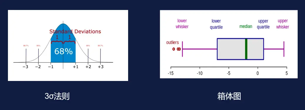 如上圖所示,左圖是我們經常聽到的 3σ 法則,3σ 法則比較簡單但很實用,它是一個經驗法則,具體是什麼意思呢?其實 σ 是標準差,當我們檢測數據服從正常的統計分佈時,我們可以將超過 3σ 的數據認為是異常數據。它的標準均值為 0,從標準分佈圖來看,大約有 0.3% 的數據為異常值。當然如果你的均值是非 0 分佈,你可以把均值加上去。不過由於 3σ 法則是一個經驗法則,還是比較粗糙的,因此在實際工作中,建議大家只在某些特定的場景下使用它。
