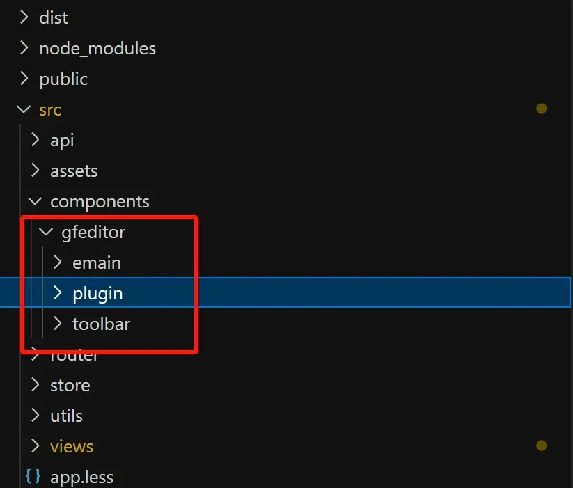 如圖1在components下的gfeditor就是編輯器代碼包,其中emain是編輯器主體代碼、plugin是插件代碼(擴展插件可放在這裏)、toolbar是編輯器的工具工具欄(圖2)。